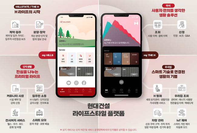 현대건설은 나날이 진화하는 스마트홈 기술과 다양화되는 주거 서비스를 고객들이 손쉽게 이용할 수 있도록 UI와 UX가 강화된 입주민 전용 토털 서비스 플랫폼을 새롭게 론칭한다고 밝혔다. ‘마이 힐스’와 ‘마이 디에이치’는 입주 전 분양이나 청약 정보부터 입주 후 A/S, 홈 IoT, 커뮤니티 사용에 이르기까지 고객 여정에 따른 현대건설만의 특화 서비스를 모바일로 간편하게 이용할 수 있는 애플리케이션이다.