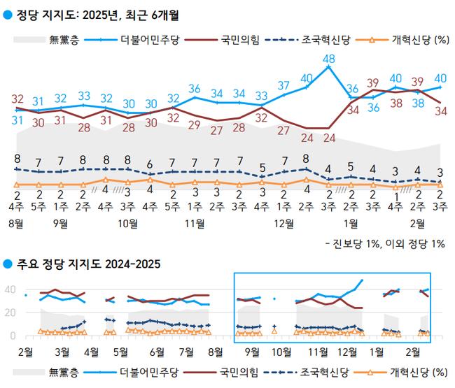 정당 지지도에서는 더불어민주당이 지난주 대비 2%포인트 상승한 40%, 국민의힘은 5%포인트 하락한 34%를 기록했다. 양당 격차(6%포인트)는 여전히 오차범위 내이지만, 최근 여권 지지층의 이탈이 감지되고 있다.