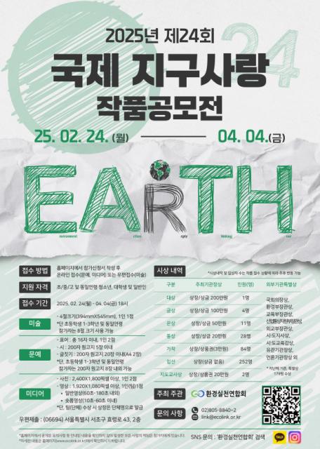 환경실천연합회(이하 환실련, 회장 이경율)가 세계 환경의 날을 기념하고 환경문제에 대한 인식을 높이고자 ‘제24회 국제 지구사랑 작품공모전’(이하 작품공모전)을 개최한다.