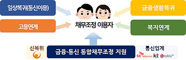 통합채무조정을 신청하면 채무자의 상환 능력을 고려해 상환 기간을 최장 10년까지 조정하고, 일정 기간 성실 상환 시 통신서비스 이용을 재개할 수 있도록 돕는다. 또한 취약계층의 경제적 자립을 지원하기 위해 국민취업지원제도, 내일배움카드 등 고용지원 프로그램과 연계하며, 생계·주거·의료 등 복지서비스도 함께 제공한다.