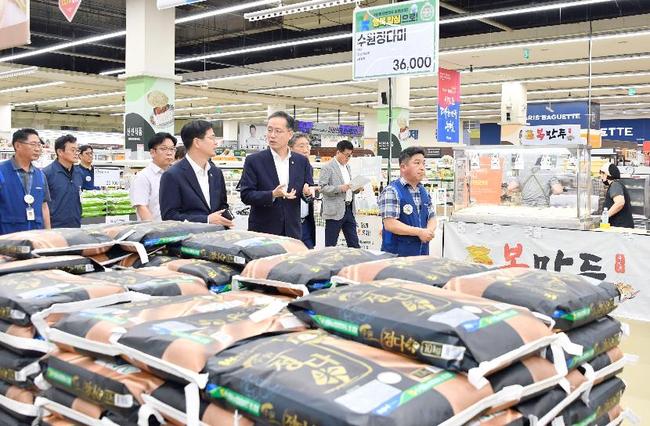 이형일 기획재정부 차관이 강형석 농림축산식품부 차관과 함께 7월 23일 오후 서울 서초구 농협하나로마트를 방문, 매장을 시찰하며 주요 농축산물 수급 현황과 생활 물가 동향을 점검하고 있다.