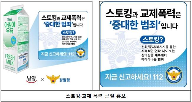 경찰청(청장 직무대행 유재성)은 스토킹과 교제폭력 등 관계성 범죄 근절을 위해 9월 19일부터 남양유업과 함께 우유 팩을 활용한 대국민 홍보 활동을 시작했다고 밝혔다.