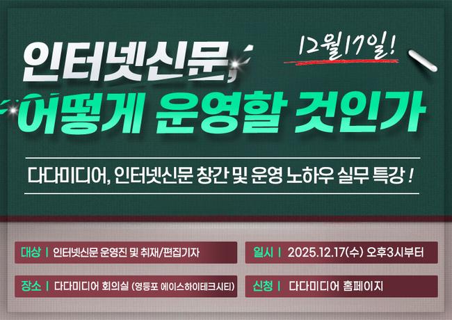다다미디어 ‘인터넷신문, 어떻게 운영할 것인가’ 창간·운영 실무 강좌 개최 - 올해 마지막 설명회… 출입처 등록부터 AI 기사 작성까지 전 과정 안내 - 인터넷신문 1만 개 시대, 실전 중심의 운영 전략 제시