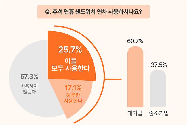 먼저, 직장인들에게 19~20일 이틀 모두 연차를 사용하는지 물어봤다. ▲이틀 모두 사용한다(25.7%) ▲하루만 사용한다(17.1%) ▲사용하지 않는다(57.3%)로, 직장인 10명 중 4명(42.7%)이 이번 추석 연휴에 연차를 사용한다고 답했다.
