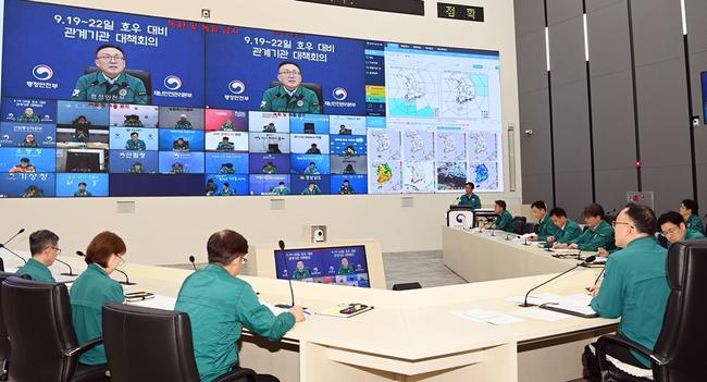 이한경 행정안전부 재난안전관리본부장이 19일 오후 정부세종청사 중앙재난안전상황실에서 9.19 · 22일 호우 대비 관계기관 대책회의를 점검하기 위한 시 · 도 부단체장 긴급대책 영상회의를 주재하고 있다.