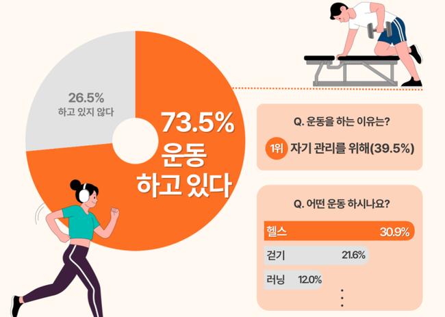 연령별에서는 ▲30대가 77.6% 비율로 1위에 꼽혀 가장 운동을 많이 하는 연령대로 꼽혔다. 다음으로는 ▲20대(74.1%) ▲50대 이상(73.9%) ▲40대(68.2%) 순이었다.